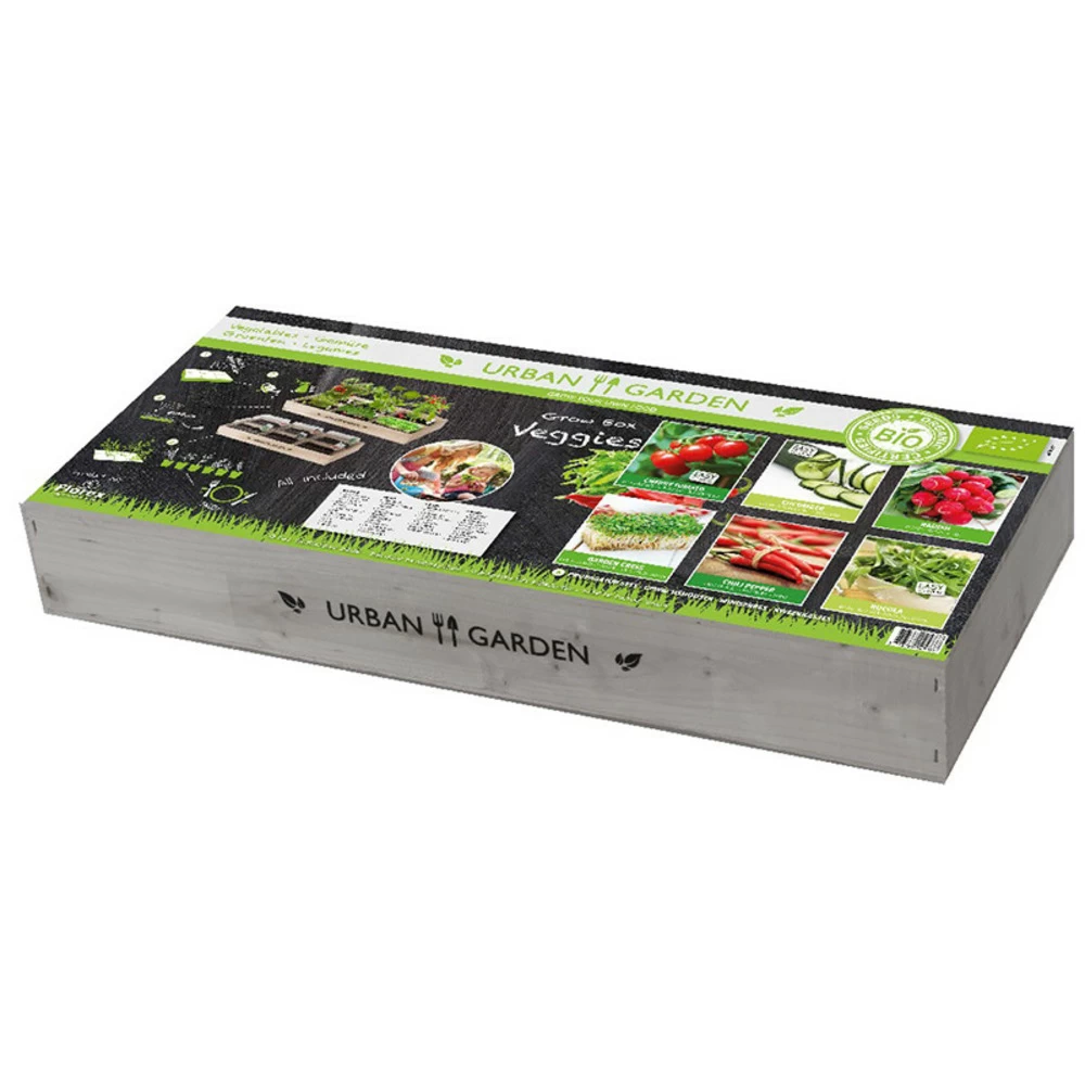 Potager urbain de lĂ©gumes bio : adaptĂ© aussi bien pour l’intĂ©rieur que pour l’extĂ©rieur ! Coffret contenant 6 compartiments pour cultiver très facilement vos lĂ©gumes bio Ă la maison. Cultivez vos lĂ©gumes bio vous mĂŞmes : tomates cerises, salade roquette, piments, concombres, cresson et radis. Tout est prĂ©vu dans ce kit prĂŞt Ă l’emploi : terreau, graines, serres, Ă©tiquettes, conseils de plantation…