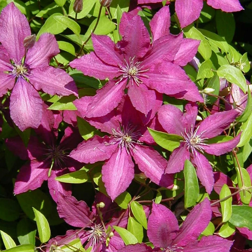 fleur de taille moyenne rouge magenta avec des sĂ©pales ronds. Cette variĂ©tĂ© est originaire d’estonie et issue d’un croisement entre la clĂ©matite ernest markham et ‘valge daam’.