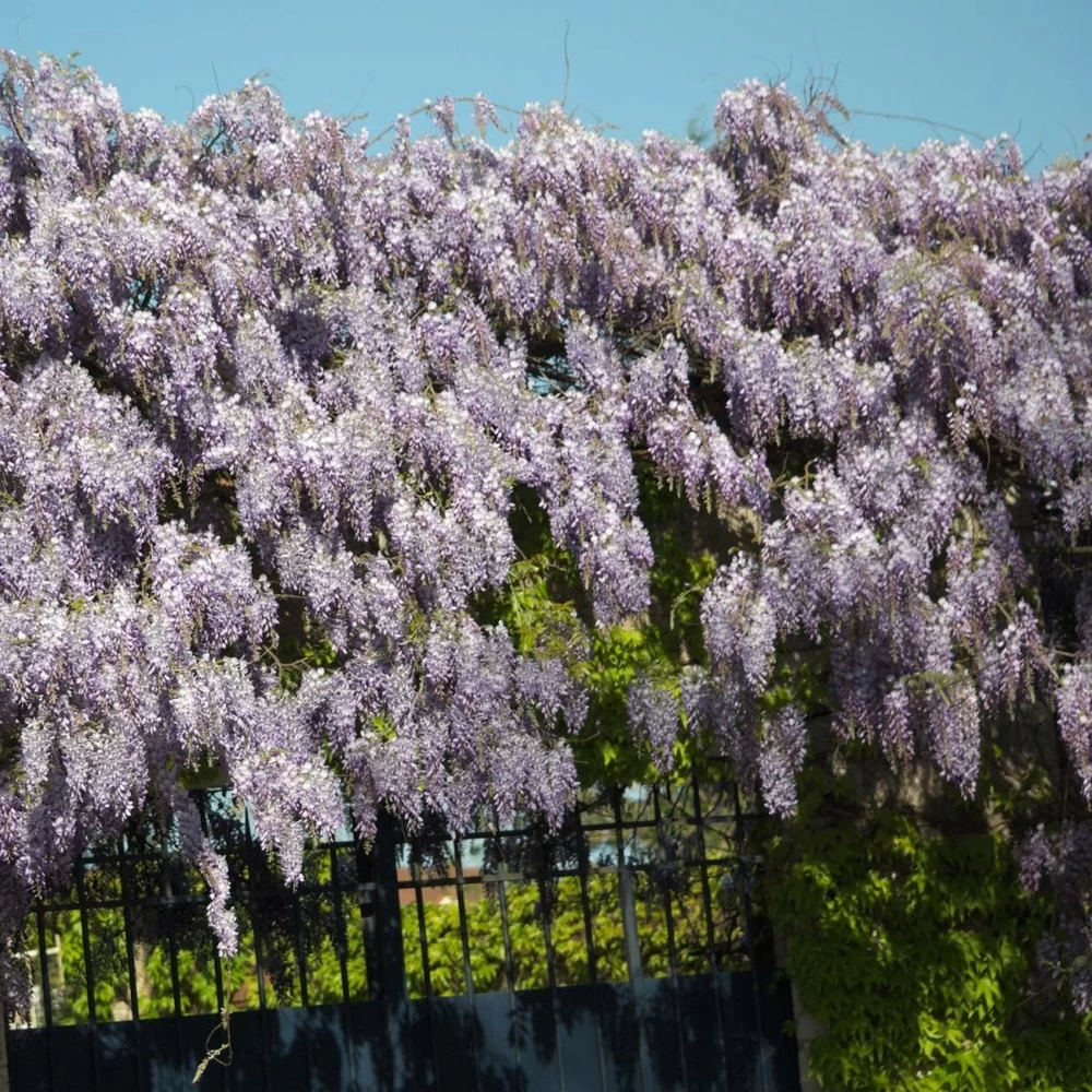 la floraison massive bleu-violet soutenue, en grappes de 35 Ă 50 fleurs et de 20 Ă 30 cm de long, surgit avant l’apparition du feuillage. C’est la glycine la plus rĂ©pandue et la seule Ă refleurir plus ou moins abondamment pendant l’Ă©tĂ©. Ces fleurs dĂ©gagent un très agrĂ©able parfum.