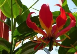 le lis de malabar exotique est un abrisseau vivace grimpant qui atteint une hauteur jusqu’Ă deux mètres Ă l’aide d’un support pour plantes grimpantes et qui peut ĂŞtre bien entretenu en pot. Ses inflorescences sont durables une fois coupĂ©es. Les fleurs du lis de malabar sont rouge feu avec une bordure jaune vif et se montrent Ă partir de juin. Elles font penser Ă une couronne ou Ă un papillon avec ses six pĂ©tales frisĂ©es qui sont courbĂ©es vers l’extĂ©rieur. Les rameaux dĂ©licats deviennent très longs au cours de l’Ă©tĂ© et ont besoin d’un support auquel le lis peut s’attacher avec les pointes de ses feuilles.