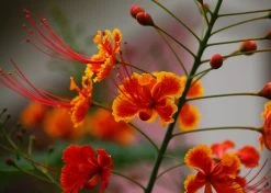 le flamboyant florifère, dont le nom d’origine pride of barbados (orgueil de la barbade) vient de son habitat naturel, forme des fleurs innombrables sur ses jolies feuilles alternes et pennĂ©es. Les fleurs rouges ou oranges avec leurs bords jaunes ont une inflorescence de jusqu’Ă 40 cm, oĂą ses Ă©tamines et ses styles sortent loin des fleurs. On peut obtenir de l’acide tannique de ses fruits, cet acide peut ĂŞtre transformĂ© en couleur ou en encre. Le flamboyant est une plante qui croĂ®t rapidement dans un pot et peut atteindre une hauteur de 2 mètres.