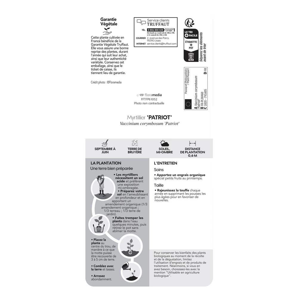 Arbuste buissonnant, vigoureux et Ă port presque Ă©rigĂ©. Compact et rustique, il offre un magnifique feuillage orange vif Ă l’automne. ‘Patriot’ ne craint pas trop les maladies telles que le phytophtora. La floraison est prĂ©coce, elle a lieu dĂ©but mai. Mais cette variĂ©tĂ© est rĂ©sistante au froid, et offre mĂŞme un rendement rĂ©gulier et Ă©levĂ©. La fructification a lieu entre fin juin et fin juillet. EtalĂ©e, elle donne des grappes de myrtilles bleu foncĂ©, Ă très grosses baies, fermes, au goĂ»t rustique. La rĂ©colte est facilitĂ©e par le port de l’arbuste.