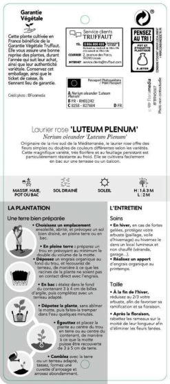 Nerium Oleander est un grand arbuste qui fleurit gĂ©nĂ©reusement de mai Ă octobre. Les fleurs tubulaires Ă 5 pĂ©tales soudĂ©es sont groupĂ©es en cimes terminales au bout des rameaux. Il existe plus dâune centaine de variĂ©tĂ©s de Laurier rose, Ă fleurs simples ou doubles, parfois parfumĂ©es. Les couleurs de floraison peuvent ĂȘtre blanche, jaune, saumonĂ©e, rose, rouge, mauve. Le feuillage persistant est dâun vert lĂ©gĂšrement gris, plus clair sur le dessous. Les feuilles simples sont opposĂ©es ou verticillĂ©es par 3. Elles sont lancĂ©olĂ©es de 10 Ă 15 cm de long et pratiquement sessiles, directement attachĂ©es sur les rameaux. Lâarbuste est ramifiĂ© dĂ©s la base, ce qui crĂ©e une touffe dressĂ©e assez dense de 2 Ă 4, 5 mĂštres de haut pouvant ĂȘtre utilisĂ©e aussi bien en haie libre quâen plante isolĂ©e en bac. ‘Luteum Plenum’ est un laurier rose aux grandes fleurs doubles ivoire, jaune d’or Ă la base des pĂ©tales. Ses feuilles sont persistantes, coriaces, vert sombre.