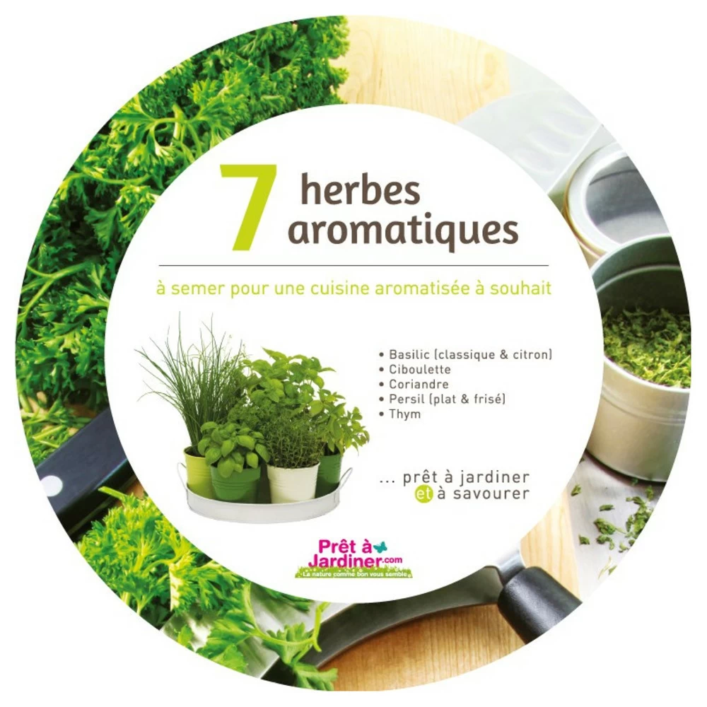 Mon jardin aromatique dans la cuisine. Jardiner, c’est aussi faire pousser ses herbes aromatiques directement dans sa cuisine. Finis les intermĂ©diaires. Directement du producteur au consommateur. Les 7 herbes : basilic classique, basilic citron, ciboulette, coriandre, persil plat, persil frisĂ©, thym. Dimensions : diamètre 27 cm – hauteur : 8 cm. Plateau et pots en mĂ©tal peint. Â